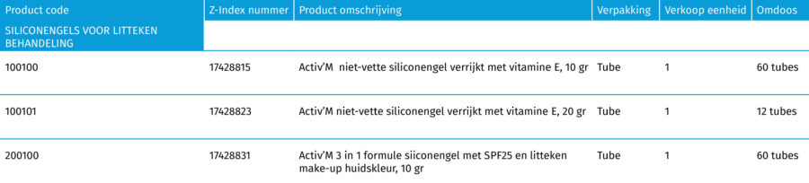 activ’M siliconengel is speciaal ontwikkeld voor kleine en/of zichtbare littekens (bijvoorbeeld op gezicht, hals of handen). De gel is verrijkt met vitamine E, droogt snel, is onzichtbaar en voelt niet plakkerig aan. Ook beschikbaar met UV-bescherming (SPF 25).